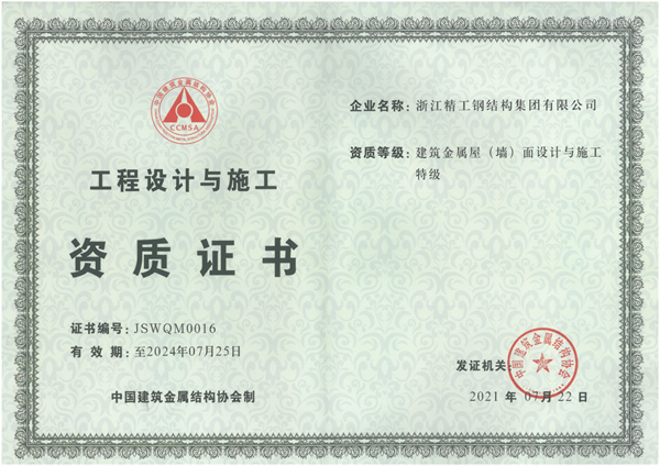 918博天堂钢构与上海精锐是中国修建金属结构协会认定的首批修建金属屋(墙)面设计与施工特级资质企业。。。。经由二十余年生长、积累,,,,,918博天堂钢构已拥有如“修建工程施工总承包壹级”、“钢结构工程专业承包壹级”、“轻型钢结构工程设计专项甲级”、“中国钢结构制造企业(特级)”、“网格结构专项(特级:管桁架结构)”、“中国金属围护承包商特级”等众多资质。。。。