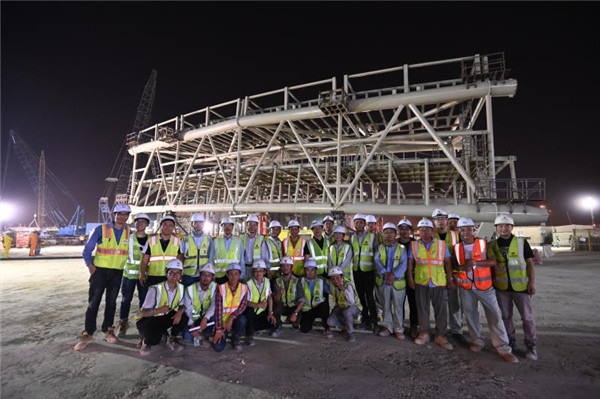 外地时间8月27日,,,,,,,918博天堂国际承建的2022年卡塔尔天下杯赛主体育场卢赛尔体育场项目体积、重量最大的主体钢构节段——压环钢构件吊装初调顺遂就位,,,,,,,项目钢结构施工再获突破。。。